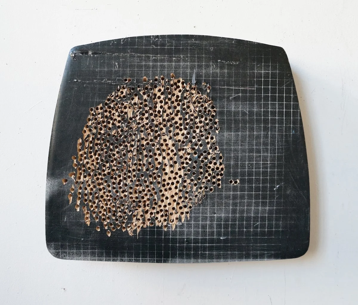 Untitled Seat, 2013, Drilled and painted found object, 18x3.5x15.5 inches