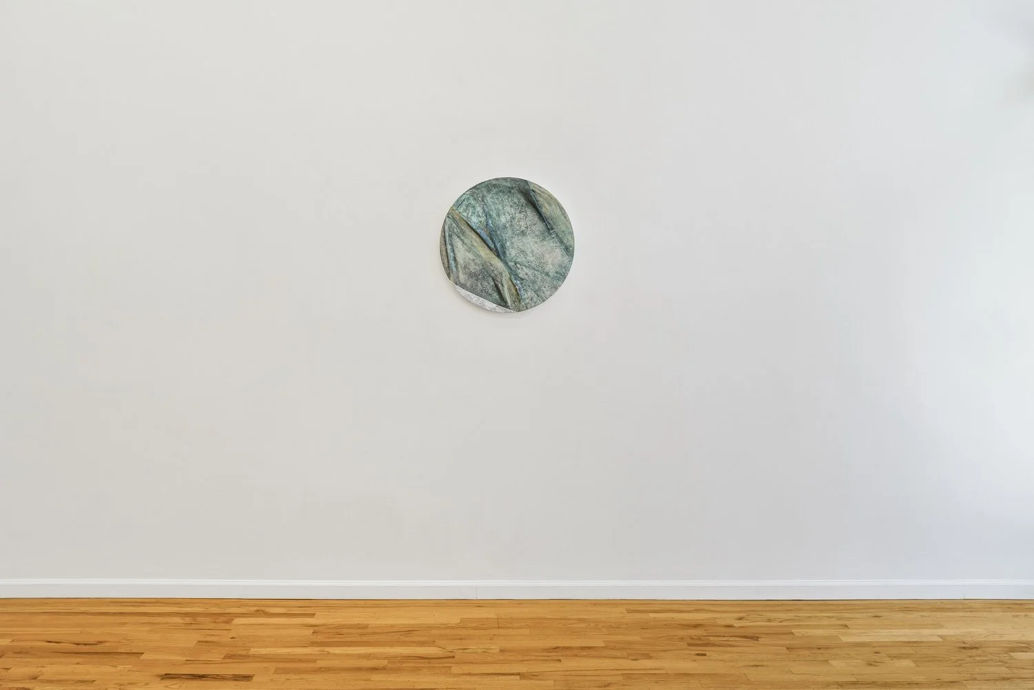 detail, No Horizon (#4), 2024, Ink, acrylic, graphite, colored pencil, and papier-mâché on panel, 23 inch diameter