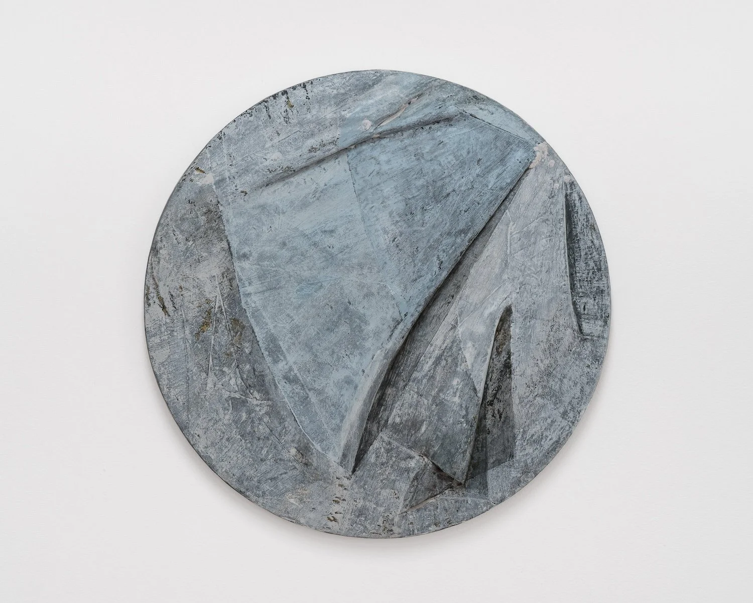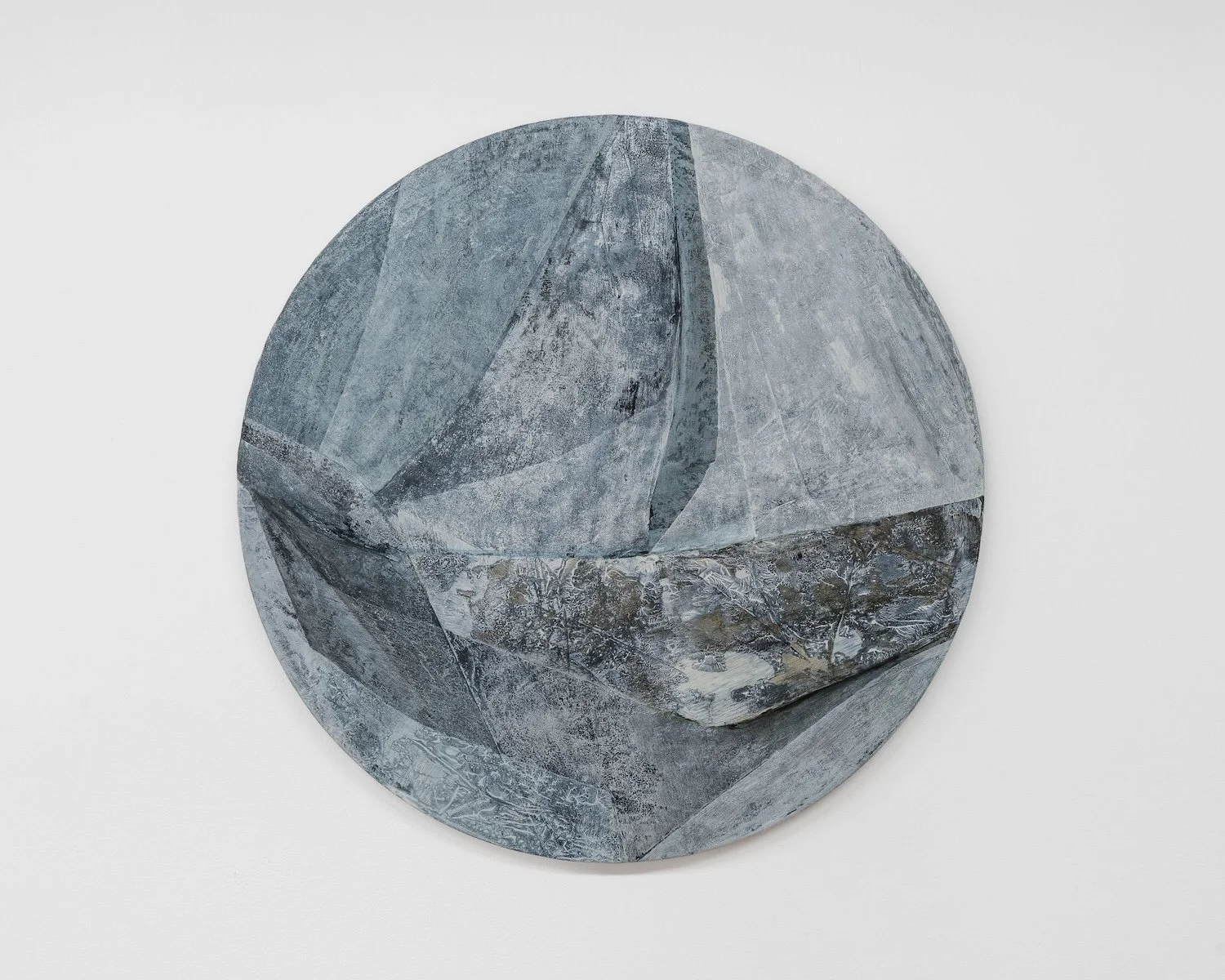 No Horizon (#1), 2024, Ink, acrylic, graphite, colored pencil, and papier-mâché on panel, 23 inch diameter